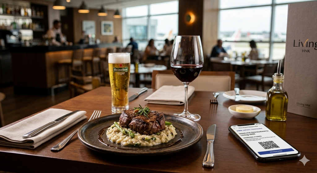 Uma das grandes vantagens do DragonPass (VAC) sobre os concorrentes é a facilidade de usar o benefício em restaurantes. Quando uma sala VIP está lotada — um problema comum em horários de pico — ou o aeroporto não possui lounge no terminal específico, você pode utilizar sua “cota de acesso” para obter um crédito de alimentação.