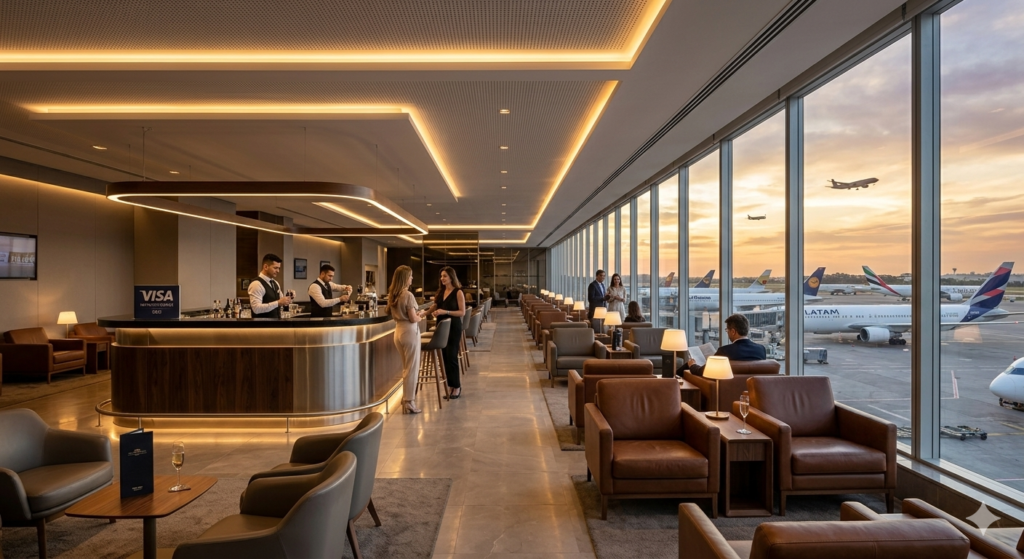 A presença do VAC no Brasil atingiu maturidade total. O destaque absoluto fica para o Aeroporto de Guarulhos (GRU), onde a Visa opera espaços próprios que são referência em sofisticação.